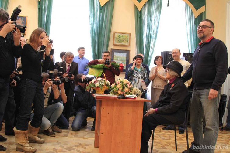 Глава уфимской администрации Ирек Ялалов прикрепил на лацкан пиджака автору выставки Фании Шевчук юбилейную медаль к 70-летию Великой Победы.