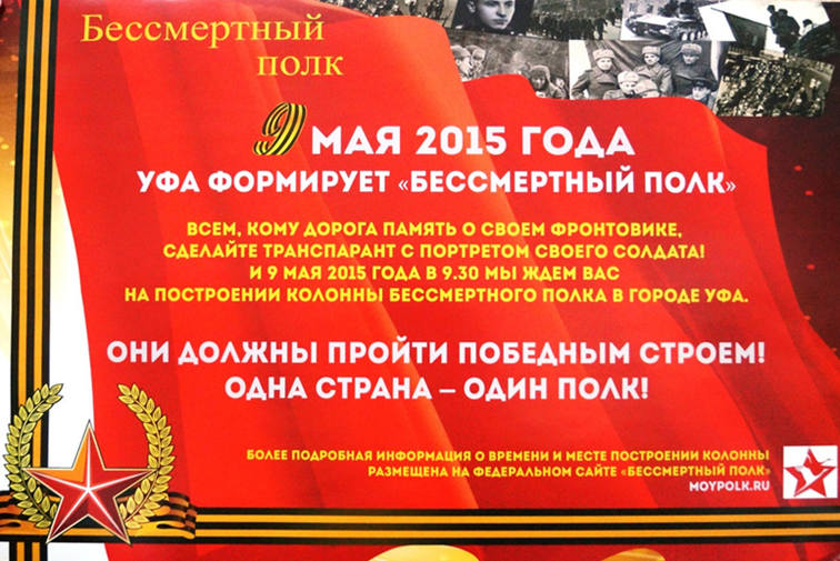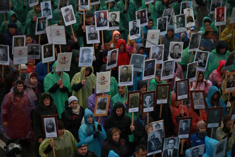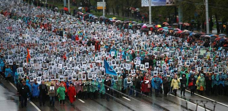 В Москве участников такой же акции набралось больше миллиона, а по всей стране еще больше. Ее идея заключается в том, что люди по собственному желанию приходили на парад с портретами своих дедов и прадедов, принимавших участие в Великой Отечественной войне.