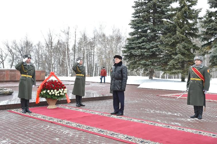 Глава республики возложил живые цветы к памятнику, посвященному бессмертному подвигу Героев Советского Союза Александра Матросова и Миннигали Губайдуллина, у подножия которого горит Вечный огонь.