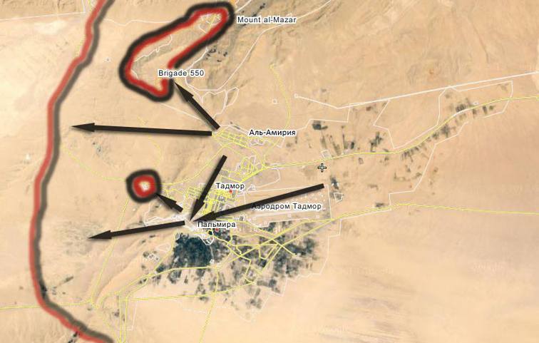 На снимке внизу: план-схема времен захвата боевиками так называемого «Исламского государства» сирийского города Тадмор и древней Пальмиры в мае 2015 г. Наглядно показан план данного района боевых действий - населенный пункт Тадмор, аэродром Тадмор, историко-архитектурный комплекс Пальмира.