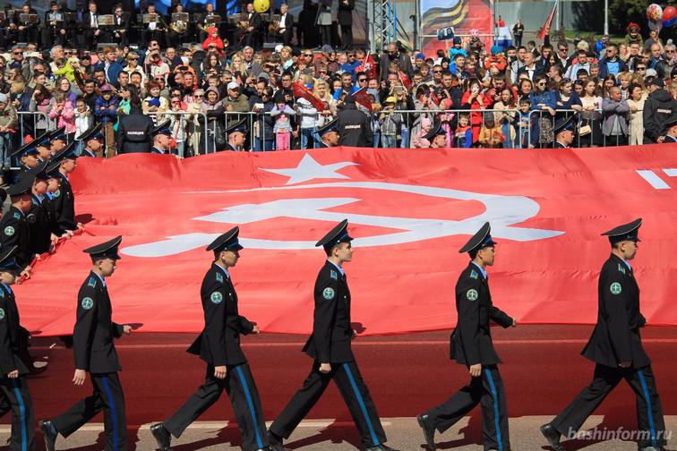 Возглавила колонну уфимского «Бессмертного полка» копия Знамени Победы, являющаяся официальным символом Победы советского народа и Вооруженных Сил над фашистской Германией в Великой Отечественной войне.