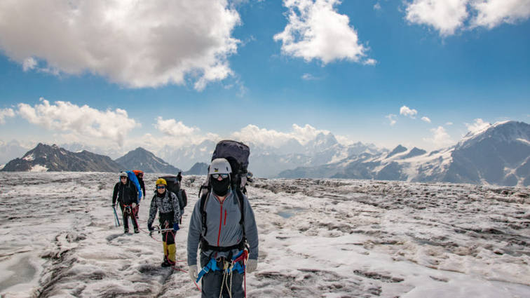 Так что я хорошо подготовился. Но это не значит, что потом было легко. Подъем был очень трудным. Идти с рюкзаком в горы непросто: тяжесть на плечах, на спине… Сначала была тропа, по ней более-менее можно идти, а потом начались каменные россыпи – курумники. На третий день вышли к леднику. На ботинки надеваешь «кошки» – зацепы, в руки берешь ледоруб и идешь дальше по уже по обледенелому склону в связке. Кто-то более физически подготовлен, кто-то менее, темп дыхания сбивается… Но меня дыхание не подвело – тренировки в бассейне помогли.