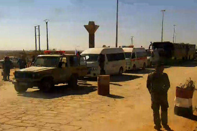 В районе гуманитарных коридоров видны десятки автобусов и автомобилей скорой помощи для эвакуации больных и раненых.
