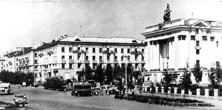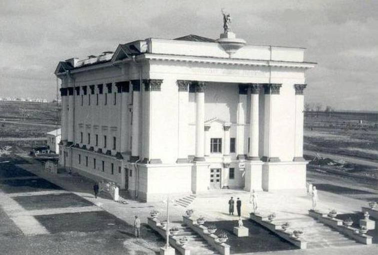 Первое время кинотеатр строился силами немецких военнопленных практически в чистом поле, на котором раньше выращивали картофель. Здание кинотеатра на этом участке оказалось первым, остальные здания строились уже позже. Строительство кинотеатра шло 4 года и завершилось в 1949 г.