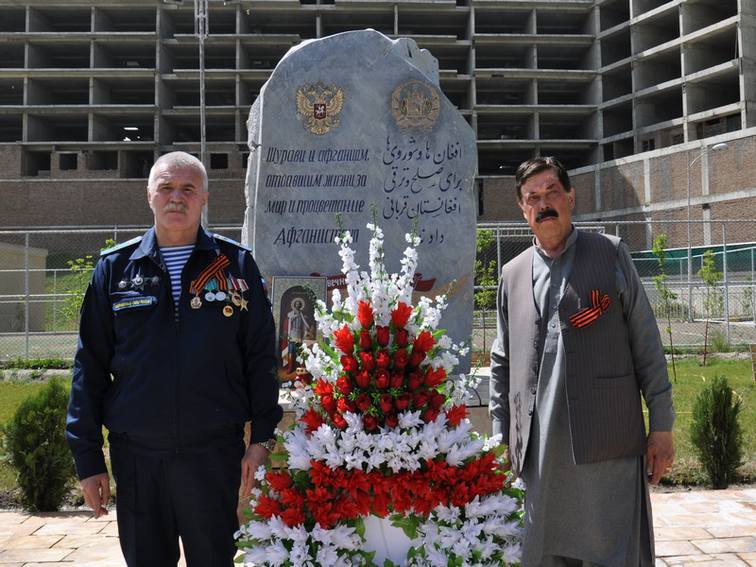 На фото: 7 мая 2017 г. в Российский центр науки и культуры в Кабуле пришли известные и влиятельные представители афганской общественности, чтобы отдать дань уважения России, внесшей основной вклад в достижение Победы над фашизмом. В Афганистане, где война не прекращается уже более сорока лет, потребность в мире ощущается особенно остро. Большое впечатление на всех участников произвело торжественное открытие Монумента памяти. С волнением молодые люди читали надпись на русском и дари: «Шурави и афганцам, отдавшим жизни за мир и процветание Афганистана».