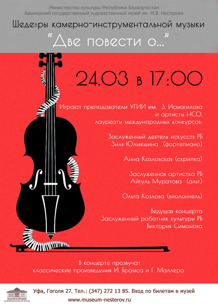 24 марта в 17.00 Министерство культуры Республики Башкортостан и Башкирский государственный художественный музей им. М.В.Нестерова приглашает ценителей классической музыки на концерт шедевров камерно-инструментальной музыки Две повести о… Играют преподаватели Уфимского государственного института искусств им. З. Исмагилова и артисты Национального симфонического оркестра, лауреаты международных конкурсов: Заслуженный деятель искусств РБ ЗиляЮльякшина (фортепиано), Анна Козловская(скрипка), заслуженная артистка РБ Айгуль Муратова (альт), Ольга Козлова (виолончель). В концерте прозвучат произведения Й.Брамса Соната для скрипки и фортепиано№3 ре минор (ор. 108), Г.МалераФортепианный квартет ля минор. Ведущая концерта – (музыкально-литературный лекторий) – Заслуженный работник культуры Республики Башкортостан СИМОНОВА Виктория Анатольевна.