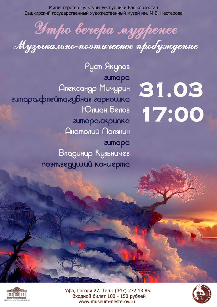 Приглашаем на концерт бардов «Утро вечера мудренее...», который состоится 31 марта в 17.00 в конференц-зале музея им. М.В.Нестерова. Участники проекта: авторы-исполнители, поэты, музыканты уфимского клуба авторской песни «Белый ворон» Руст Якупов, Александр Мичурин, Валерий Силин, Рустэм Файрушин, Юлиан Белов, Анатолий Полянин, Владимир Кузьмичев.