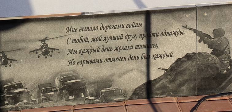 И вот наступил тот самый, долгожданный день. С монумента спадает белое покрывало. На постаменте памятника укреплено посвящение: «Погибшим – память, живущим – честь». На сновании постамента начертаны стихотворные строки: «Мне выпало дорогами войны С тобой, мой лучший друг, пройти однажды. Мы каждый день желали тишины, Но взрывами отмечен был день каждый…»