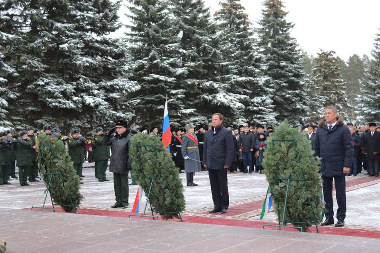 Полномочный представитель Президента России в Приволжском федеральном округе Игорь Комаров, глава Башкортостана Радий Хабиров, а также гости возложили венки в честь Дня Героев Отечества в уфимском парке Победы к памятнику Героям Советского Союза Александру Матросову и Миннигали Губайдуллину, у подножия которого горит Вечный огонь. После исполнения гимнов Российской Федерации и Республики Башкортостан участники церемонии почтили минутой молчания память защитников Отечества, не вернувшихся с полей сражений.