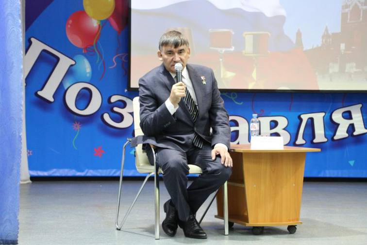 С учащимися МБОУ «Центр образования №15» г. Уфы встретился «Заслуженный военный летчик», Герой России Риф Раисович Сахабутдинов. Мероприятие началось с экскурса в историю России. Ребята подготовили трогательные видеоролики и слайд-шоу, вдохновенно рассказали стихи, посвященные важным событиям нашей страны – Куликовской, Полтавской битвам, Смутному времени, Бородинскому сражению, Афганской войне, Великой Отечественной войне и другим. Зрители завороженно следили за событиями на сцене.