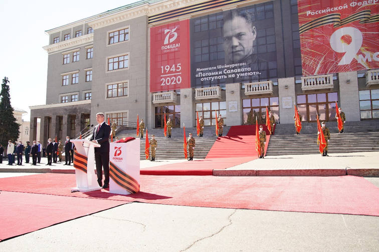 «В те трудные годы Уфа стала поистине героическим городом-тружеником, в котором для фронта производилось топливо и двигатели для самолетов, выпускались боеприпасы, шилось обмундирование. У нас были размещены эвакуированные из западных регионов предприятия и организации. Проводив мужчин на фронт, женщины, подростки и старики встали у станков, совершая трудовые подвиги, делали всё от них зависящее для бесперебойного обеспечения армии. (...)Время и сегодня выдвигает сложные задачи. Этот День Победы мы отмечаем все вместе в условиях соблюдения комплексных мер по противодействию распространению новой коронавирусной инфекции. Графики проведения торжественных мероприятий были изменены в целях заботы о здоровье ветеранов и всех жителей нашей страны. Все массовые мероприятия обязательно состоятся позднее, когда отступит угроза коронавируса».