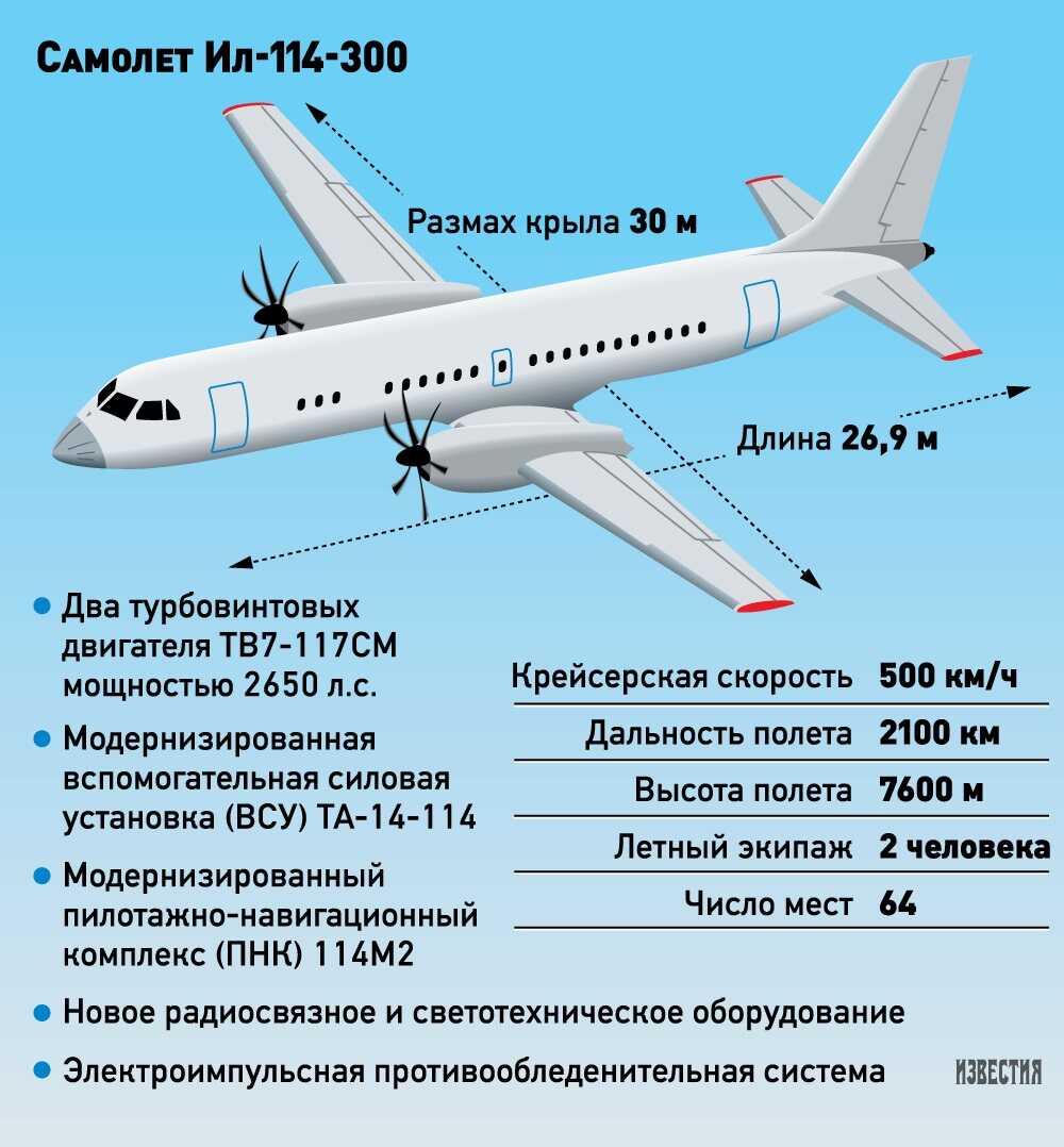 В свою очередь, региональный турбовинтовой самолет Ил-114-300 разработан конструкторским бюро ПАО «Ил» (входит в Объединенную авиастроительную корпорацию). Борт предназначен для региональных перевозок, в том числе – в труднодоступных районах Севера, Сибири и Дальнего Востока. Крейсерская скорость самолета составляет 500 километров в час, а дальность полета с максимальной коммерческой загрузкой (6,8 т) — полторы тысячи километров.