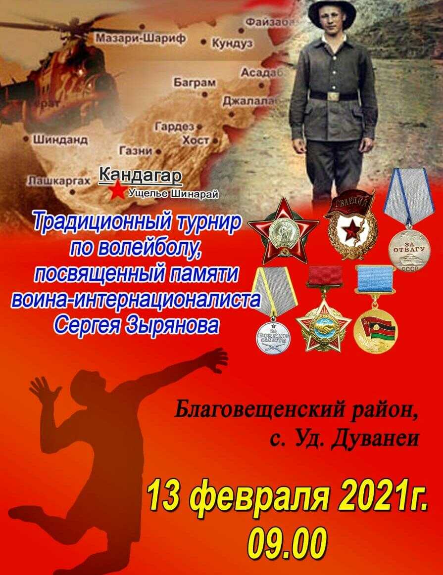 13 февраля в Благовещенском районе команда ветеранов – воинов-интернационалистов «Шурави» провела игру с командой учащихся – победительницей районного турнира по волейболу имени Сергея Зырянова, погибшего в Афганистане.