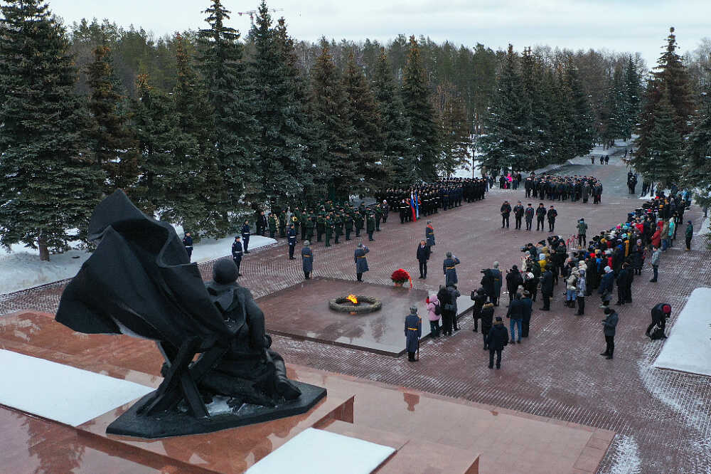 От имени многонационального народа республики руководитель региона возложил цветы к памятнику, посвящённому бессмертному подвигу Героев Советского Союза Александра Матросова и Миннигали Губайдуллина, у подножия которого горит Вечный огонь.
