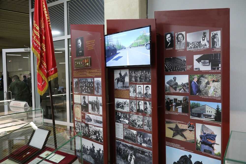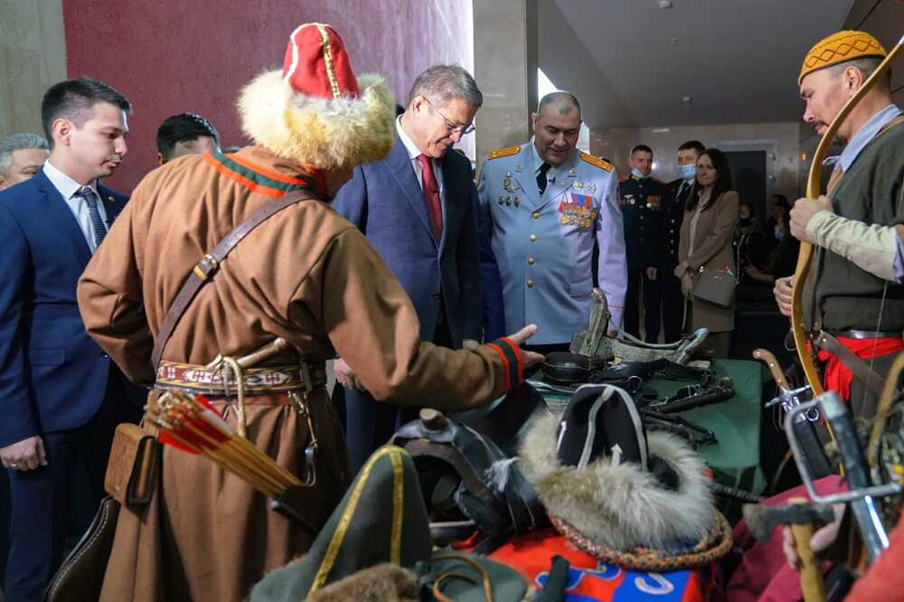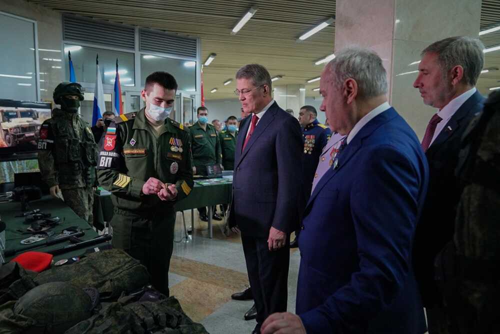 Перед началом мероприятия руководитель региона осмотрел выставку, приуроченную ко Дню защитника Отечества. Центральное место в экспозиции занимает тематическая площадка, посвящённая 112-й Башкирской кавалерийской дивизии и её легендарному командиру, генерал майору Минигали Шаймуратову. Здесь можно увидеть «Золотую звезду» Героя России — это долгожданное звание генералу Шаймуратову присвоено 30 марта 2020 года указом Президента России Владимира Путина посмертно за мужество и героизм, проявленные в борьбе с немецко-фашистскими захватчиками в период Великой Отечественной войны 1941–1945 годов.