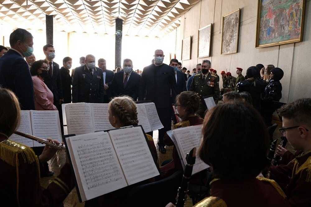 Здесь же звучали военные произведения в исполнении духового оркестра детской школы искусств под руководством О.Зарубина.