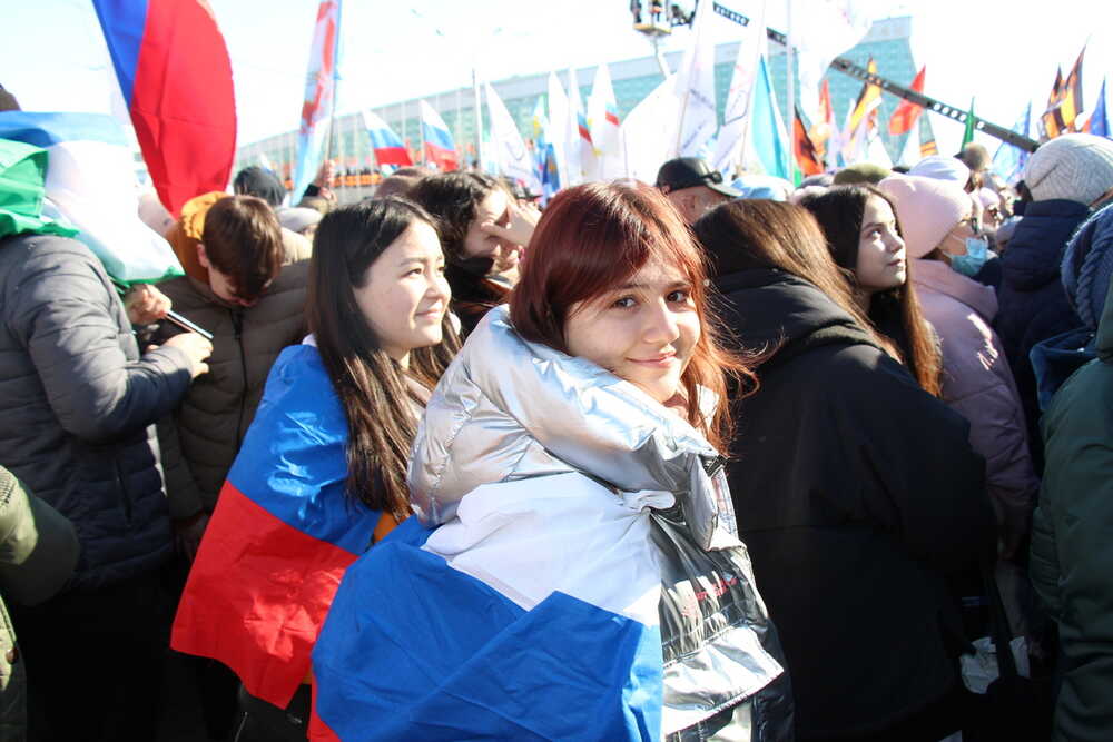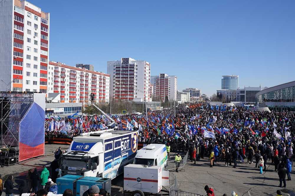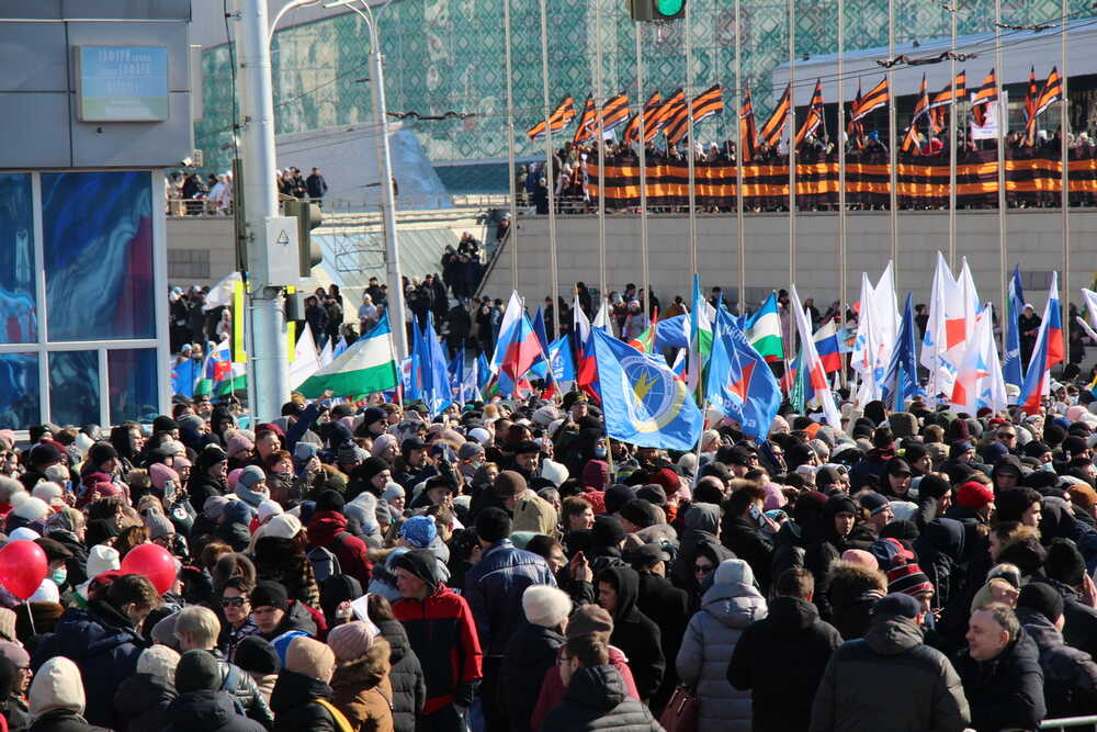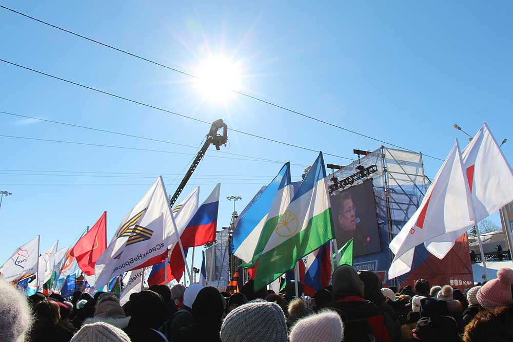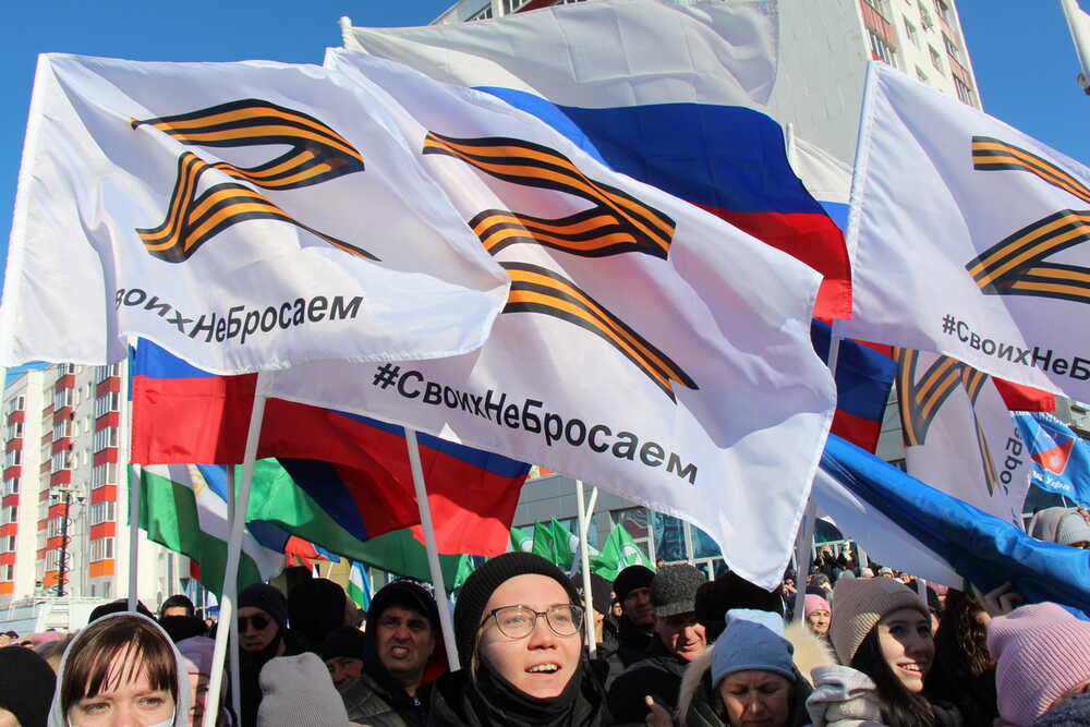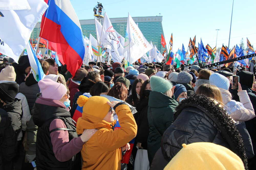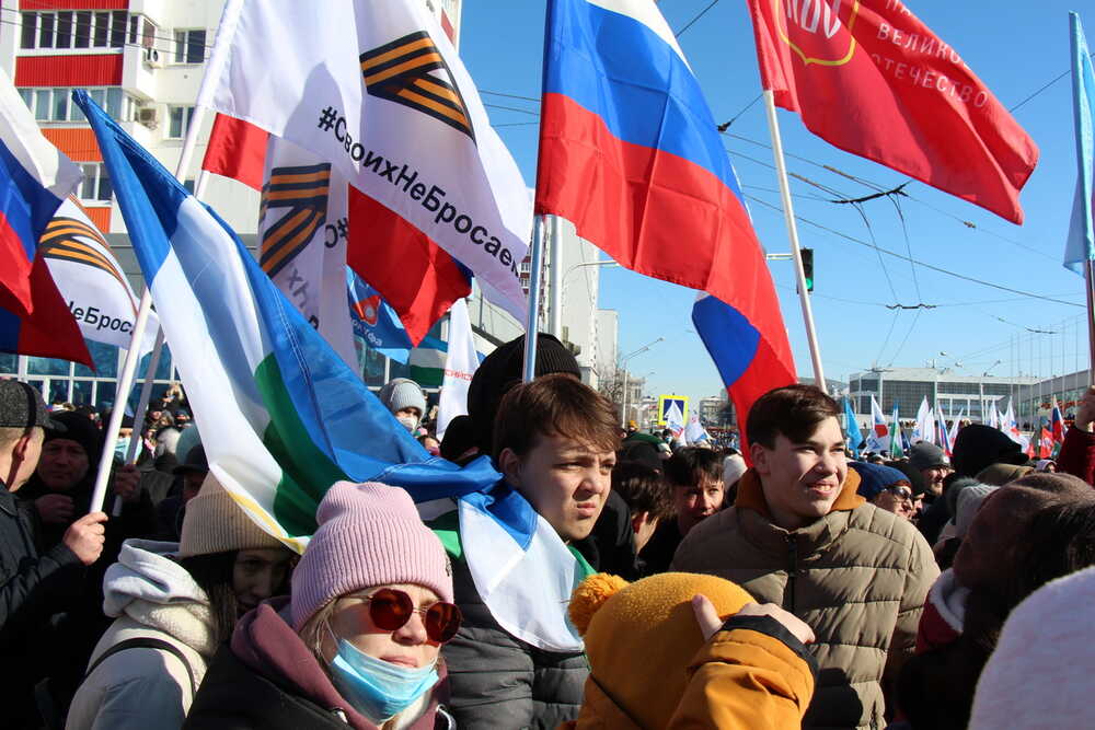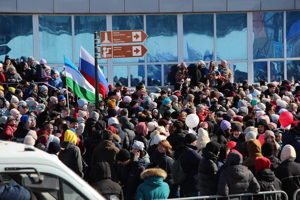 В пятницу, 18 марта в Уфе на площади перед конгресс-холлом «Торатау» состоялся масштабный митинг-концерт «Своих не бросаем!», посвященный восьмилетней годовщине присоединения Крыма к России. Участники также выразили горячую поддержку жителям ДНР и ЛНР и курса Президента страны Владимира Путина. Повсеместно звучали лозунги «Zа мир!», «Zа Россию!», «Zа Президента!». На верхней одежде большинства участников митинга красовались наклейки «Za Россию! Своих не бросаем!». Сказать, что митинг-концерт был массовым — мало: на площади Салавата Юлаева перед Конгресс-холлом «Торатау и прилегающих улицах разлилось настоящее людское море искренней солидарности. А желающие принять участие в митинге все шли и шли, шли семьями...