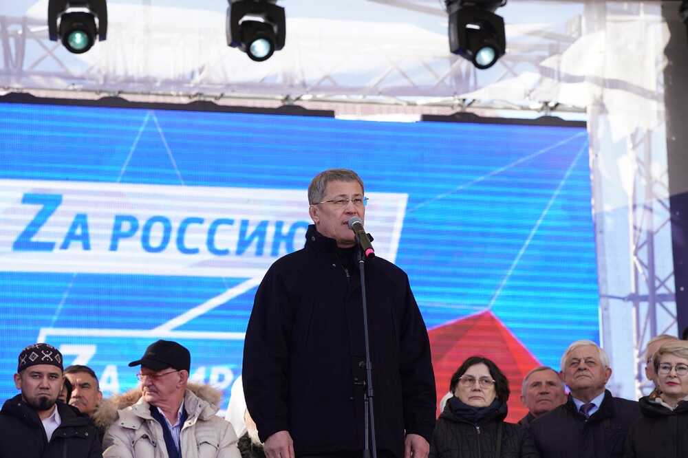 «Люди разных возрастов, национальностей и конфессий собрались для того, чтобы поддержать Президента и нашу великую Россию. Показать всему миру наше единство и силу, верность и любовь к Родине. Сейчас на территории Украины сражаются наши ребята. Бьют бандеровцев и наёмников. Проявляют настоящее мужество и героизм. Они сражаются за суверенитет, безопасность и будущее России. За освобождение братской Украины от нацизма. За мирных жителей Луганской и Донецкой народных республик», — отметил руководитель республики.