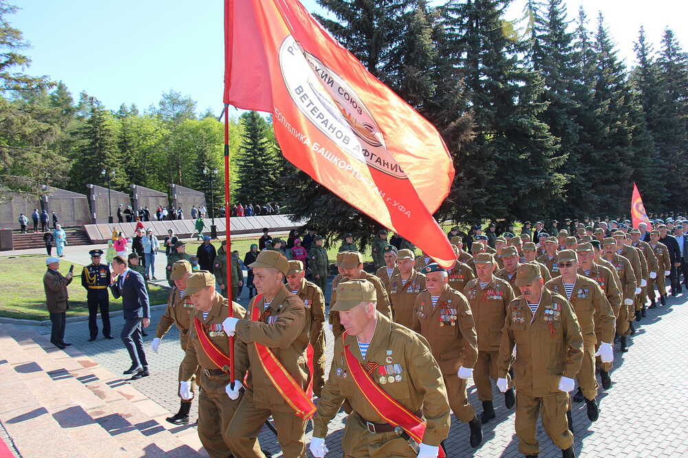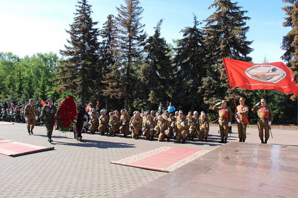 Для ветеранов боевых действий утро 9 мая началось с торжественного возложения парадной ветеранской коробкой венка памяти к Вечному огню в уфимском парке Победы. Парадная коробка ветеранов боевых действий в этом году в пятый раз приняла участие в торжественном прохождении на площади имени Ленина в Уфе в пятый раз, а возложение венка к Вечному огню в уфимском Парке Победы и гирлянды цветов к Мемориалу «Скорбящая мать» состоялось уже в тринадцатый раз.