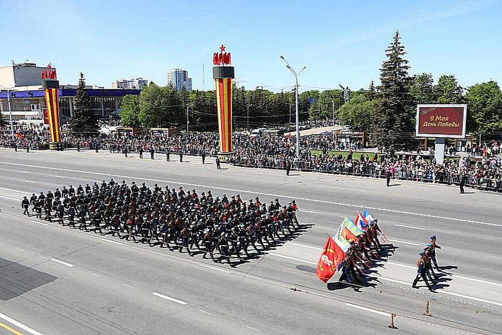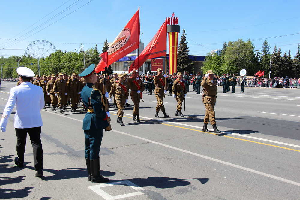 Строевым шагом по площади имени Ленина прошли более 1500 военнослужащих Уфимского гарнизона, сотрудников учреждений силовых структур, расположенных в Уфе, ветеранов боевых действий и военной службы, курсантов и кадет учебных заведений, кинологической службы МВД и парадный расчет кавалерийского взвода батальона оперативного реагирования Полка патрульно-постовой службы полиции Управления МВД РФ по Уфе.