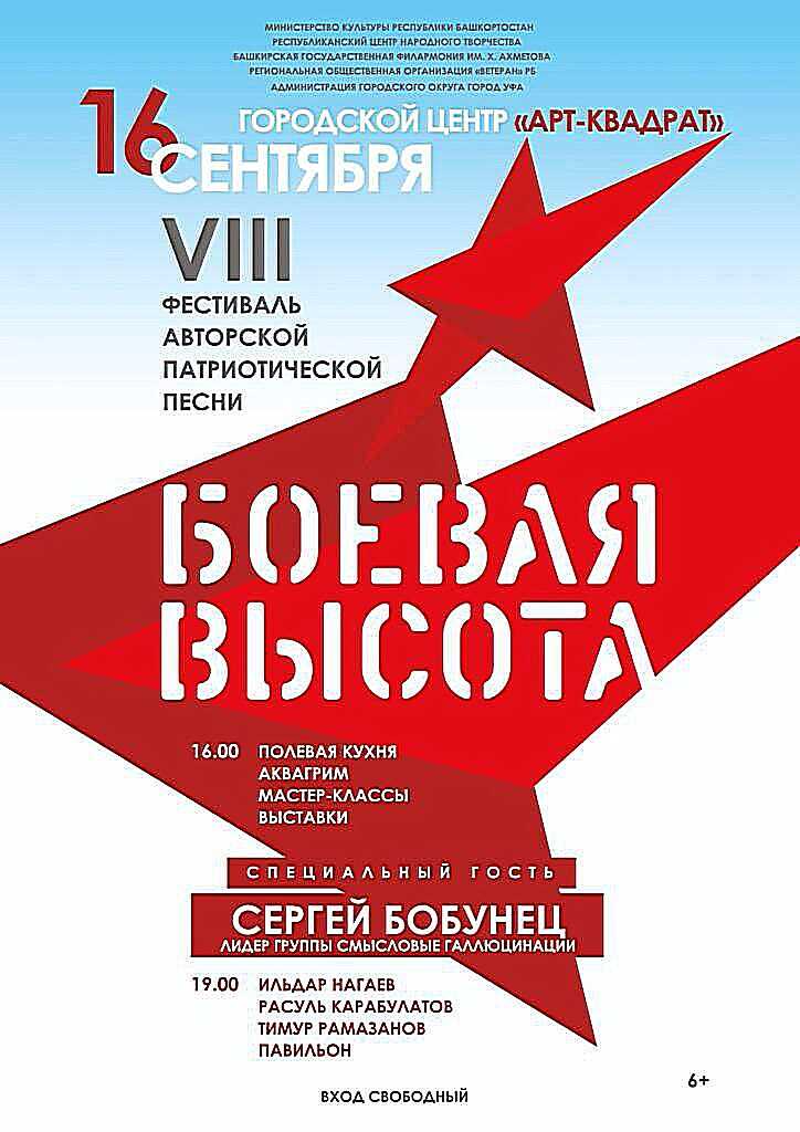16 СЕНТЯБРЯ ПРИГЛАШАЕМ УФИМЦЕВ И ВСЕХ ЖИТЕЛЕЙ РЕСПУБЛИКИ, ВСЕХ, КОМУ ДОРОГО БУДУЩЕЕ НАШЕГО ОТЕЧЕСТВА, НА ОЧЕРЕДНОЙ — VIII РЕСПУБЛИКАНСКИЙ ФЕСТИВАЛЬ АВТОРСКОЙ ПАТРИОТИЧЕСКОЙ ПЕСНИ «Боевая ВЫСОТА». В этом году Фестиваль «Боевая ВЫСОТА» посвящен нашим героическим бойцам, сражающимся в составе СВО в районе Северного Причерноморья и других областях Новороссии. Фестиваль пройдет в городском центре «АРТ-квадрат». Начало тематических активностей в 16:00. Начало концертной программы — в 19:00.