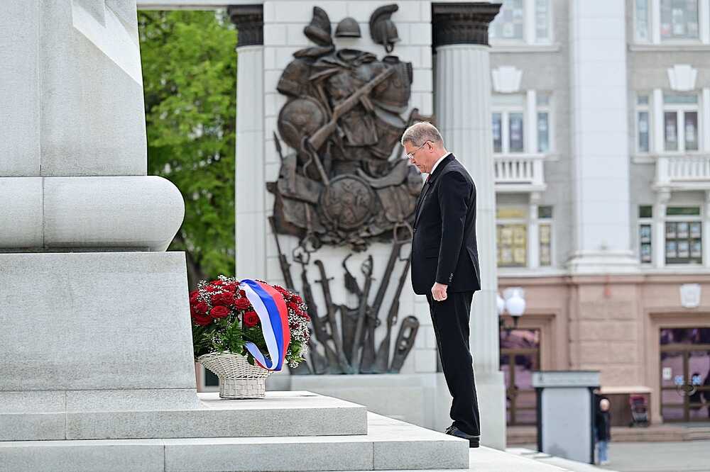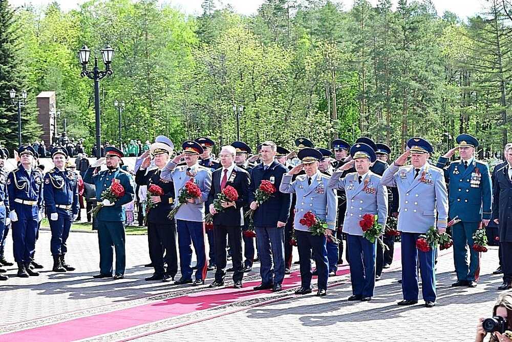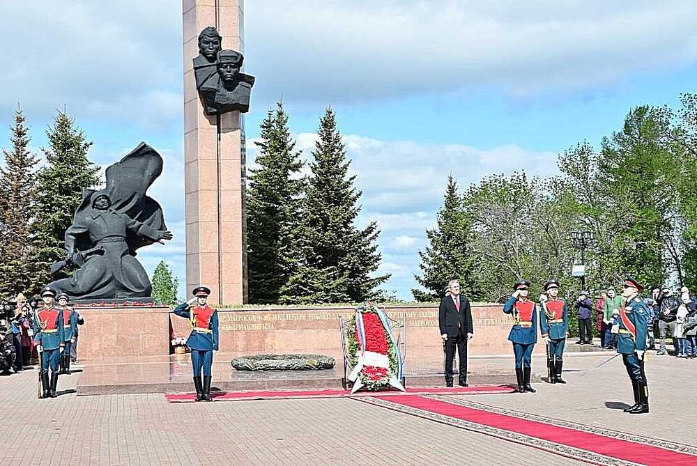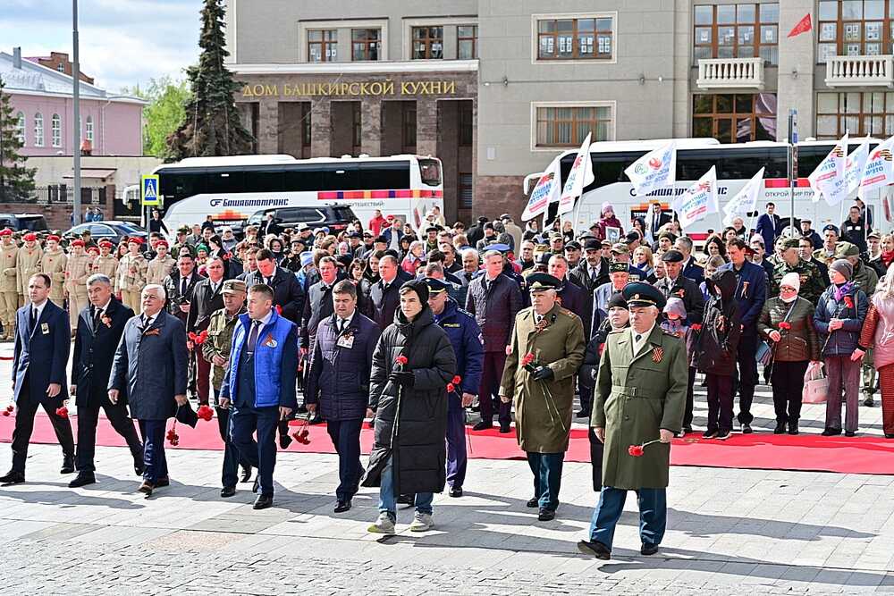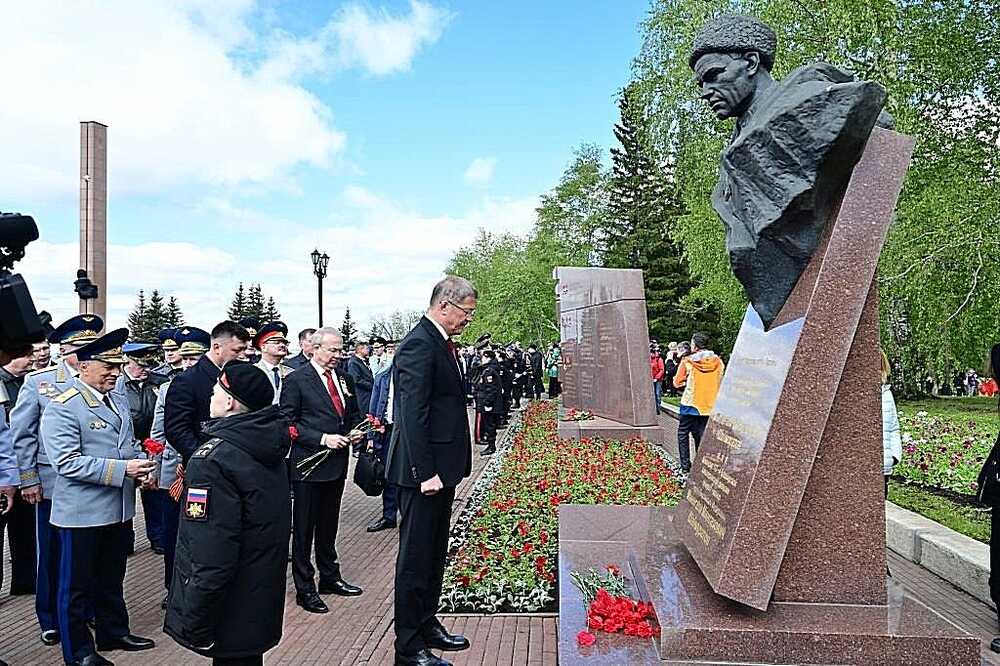 9 мая в уфимском парке Победы Глава Башкортостана Радий Хабиров принял участие в торжественной церемонии в честь 79-й годовщины Победы советского народа в Великой Отечественной войне. От имени многонационального народа республики руководитель региона возложил цветы к памятнику, посвящённому бессмертному подвигу Героев Советского Союза Александра Матросова и Миннигали Губайдуллина, у подножия которого горит Вечный огонь. В память о павших героях объявили минуту молчания. Радий Хабиров также возложил цветы к могиле дважды Героя Советского Союза Мусы Гареева, к бюстам Минигали Шаймуратова и Тагира Кусимова, на мемориальном комплексе у стелы, посвященной героям — уроженцам республики, а также памятнику труженикам тыла. Он включает скульптурную группу, символизирующую основные профессии тружеников тыла: нефтяник, сталевар, жница, швея и другие. На стеле располагается бронзовая горельефная композиция, изображающая идущие на фронт составы с военной техникой, продукцией сельского хозяйства. В верхней части стелы расположен орден Победы.