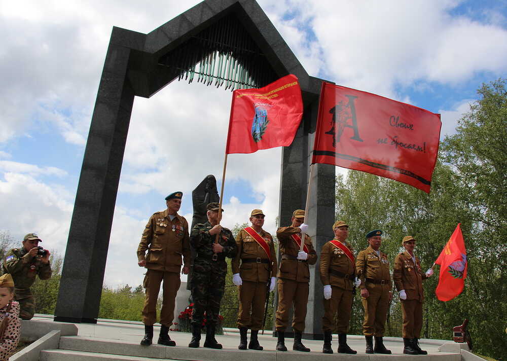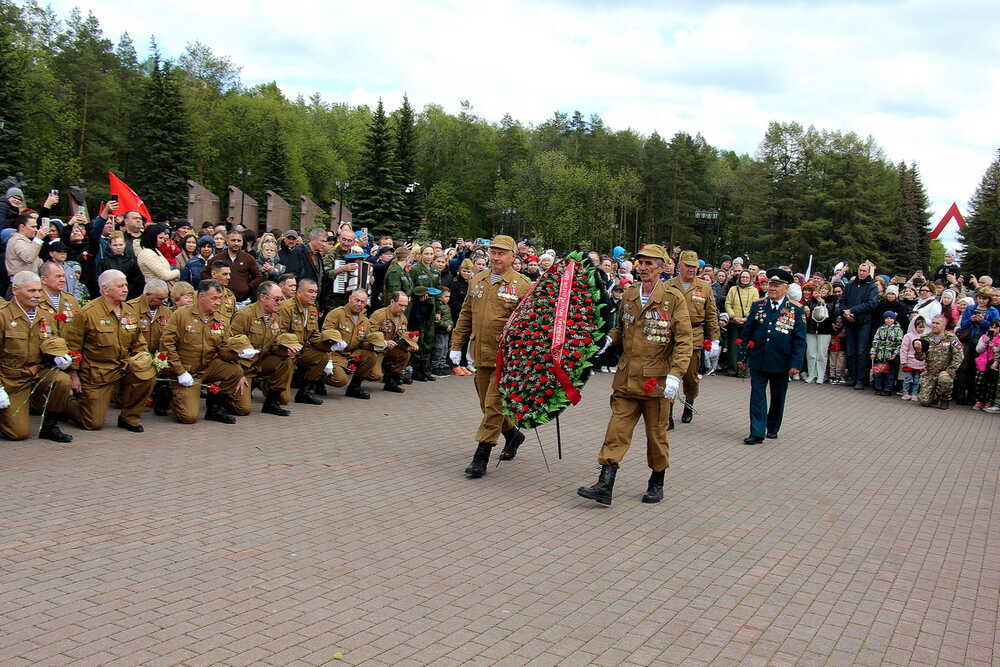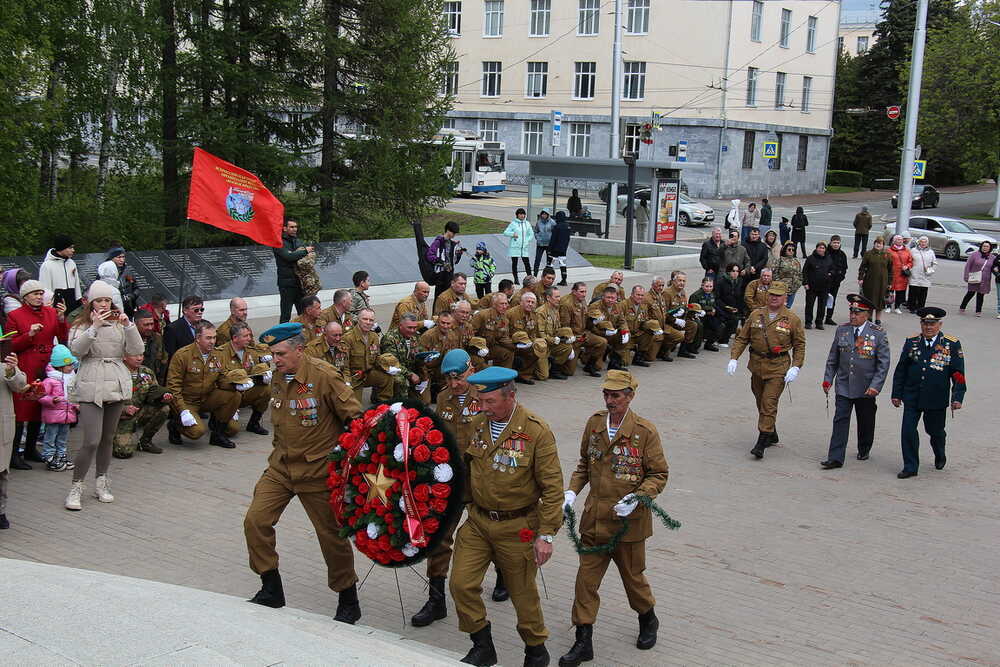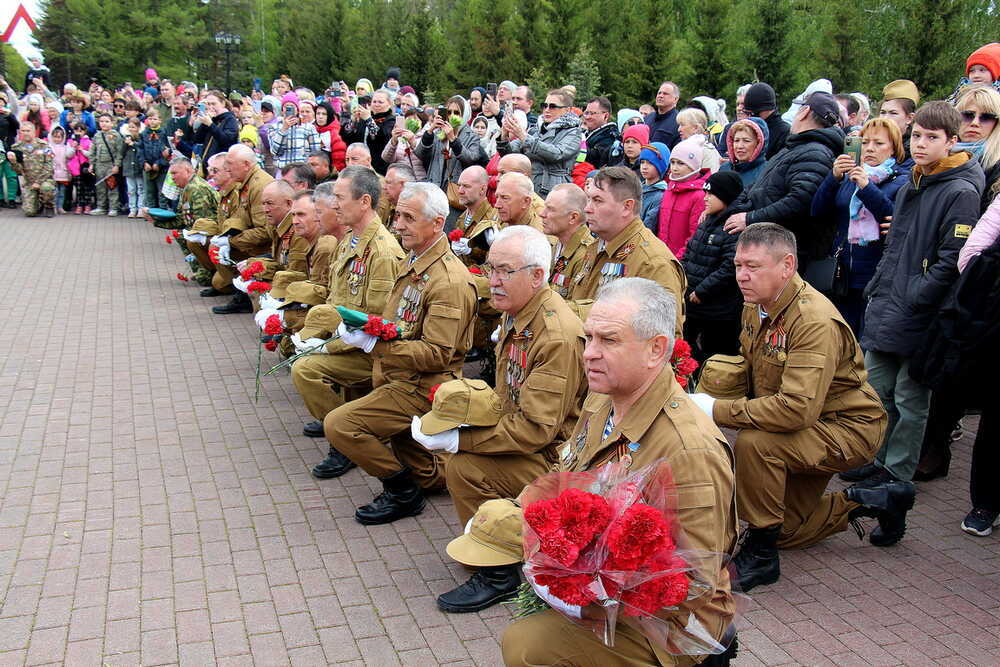 В этот день парадная коробка ветеранов боевых действий также провела с церемонией коленопреклонения торжественные возложения венков и цветов к Вечному огню в уфимском парке Победы и к мемориалу Скорбящая мать, посвящённому защитникам Отечества, павшим в локальных войнах.