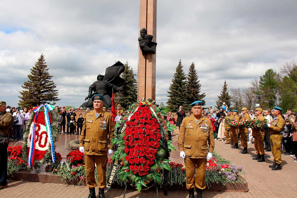 Затем парадный расчет ветеранов боевых действий в порядке маршевого следования прошёл к расположенному неподалеку от Парка Победы мемориалу «Скорбящая мать», посвященному памяти павших в афганской войне 1979 — 1989 гг, а также в других горячих точках.